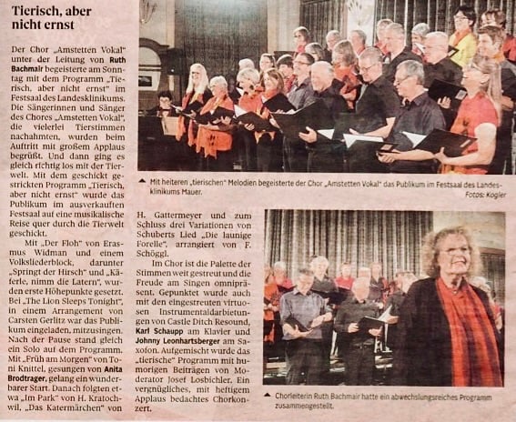 Der Chor „Amstetten Vokal" setzte mit seinem Auftritt einen musikalischen Meilenstein: Unter der Leitung von Ruth Bachmair interpretierte er beide Werke tonsicher, vital, und berührend. Das Publikum war zu Recht begeistert. Als Solisten brillierten Sonja Trauner und Josef Habringer.