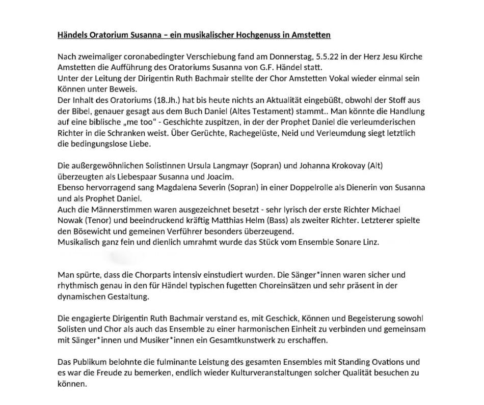 Die Chorleiterin Ruth Bachmair hatte eine klare Vorstellung, wie Haydns Werk zu klingen habe. Besonders die Gestaltung des Schlusschores ... mit der mächtigen Fuge „Des Herren Ruhm...“ hinterließ einen großartigen Eindruck... Lang anhaltender Applaus für alle Ausführenden ... war der Dank für einen festlichen Abend.